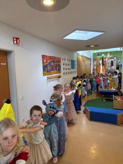 In der Turnhalle warteten spannende Kinderspiele auf die Kinder. Mit viel Begeisterung und Einsatz nahmen sie daran teil und konnten dabei sogar kleine Preise gewinnen. Ein besonderes Highlight war außerdem die Modenschau der einzelnen Gruppen. Stolz präsentierten die Kinder ihre fantasievollen Kostüme und wurden mit viel Applaus belohnt. Am Ende des Tages gingen viele kunterbunte, aber auch müde maskierte Kinder nach Hause.