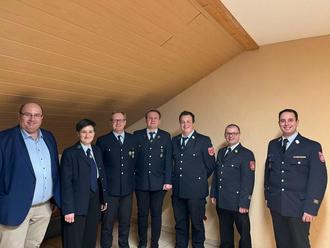Auf dem Bild von links: Bürgermeister Alexander Schrüfer, Vors. Anna Schäfer, Arnold Westermeyer, Kommandant André Münch, KBI Sven Kaniewski, KBM Mathias Gerstenberger