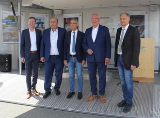Auf dem Bild von links: Landrat Florian Wiedemann, Bürgermeister Alexander Schrüfer, Peter Hübner, Vorstandsmitglied ADAC, Bayerns Innenminister Joachim Herrmann, Wolfgang Lieberth, Vorstandsmitglied ADAC