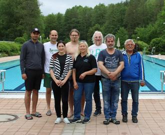 Das Freibad-Team im Bild von links: Bademeister Abduljalil Wais, Erster Bürgermeister Hartmut Stern, Kioskpächterin Simona Alexandra Neamt, vom Förderverein Freibad Hollfeld Martin Laaser und Silvia Fritsch, Thomas Hirschmann von der Wasserwacht Hollfeld, Kioskpächter Nicola Anania Neamt und Mitarbeiter des Freibades Bruno Eberlein.
