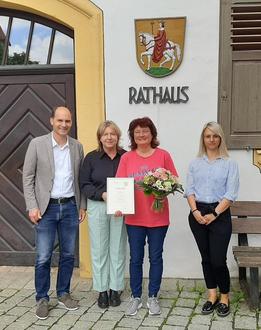 von links: Erster Bürgermeister Hartmut Stern, Personalrätin Claudia Sauer, die Jubilarin Petra Schrenker und Geschäftsstellenleitung Nicole Horzela