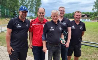 (von links): 2. Vorsitzender Thomas Bornschlegel, Bürgermeister Hartmut Stern, Herbert Sperlich, BLSV-Kreisvorsitzender und 1. ASV-Vorsitzender Markus Täuber, 3. ASV-Vorsitzender Dietmar Preißinger