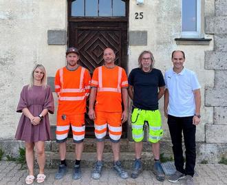 Im Bild von links: Geschäftsstellenleiterin Nicole Horzela, Bauhofleiter Patrick Bergmann, Bauhofmitarbeiter Marco Schrüfer, Personalrat Edgar Wolf und Erster Bürgermeister Hartmut Stern.