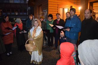 Hollfelder Vokal Ensemble mit Sebastian Stiller und Bürgermeister Hartmut Stern und dem Christkind Bella Brehm