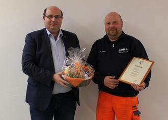 Bürgermeister Schrüfer gratulierte Degen zum Jubiläum und überreichte eine Urkunde und ein Geschenk. Er wünschte ihm weiterhin viel Spaß und Freude bei der Arbeit und hofft, dass er der Gemeinde noch lange erhalten bleibt.