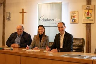 Im Bild von links: Bauamtsleiter Jörg Wittek, Frau Miller (GlasfaserPlus) und Erster Bürgermeister Hartmut Stern
