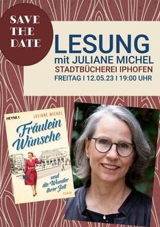 An diesem Tag bitte nichts vornehmen, weil wir dann endlich wieder eine Autorin für eine Lesung in der Stadtbücherei live zu Gast haben. Juliane Michel aus der Nähe von Würzburg wird im Mai ihren neuesten Roman „Fräulein Wünsche und die Wunder ihrer Zeit“ bei uns vorstellen. Darin geht es um eine unmögliche Liebe in den Nachkriegsjahren. Mehr dazu in den nächsten Wochen.