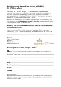 Wenn Sie Ihren Betrieb am Sonntag, 4. Mai 2025, präsentieren möchten, senden Sie bitte das Antwortformular bis spätestens Montag, 17. März 2025, vollständig ausgefüllt an die Tourist Information Iphofen zurück! Vielen Dank.