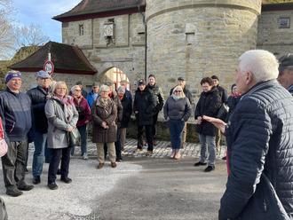 Die Katholische Erwachsenenbildung mit Rosemarie Groll hatte am 16. März 2023 zur zweiten Tour durch unbekannte Weinkeller in Iphofen eingeladen, und rund 40 Interessierte waren ihrer Einladung gefolgt. Nach einer kurzen Begrüßung am Rödelseer Tor durch Frau Groll übernahmen Heinz und Maria Halbleib, unterstützt von Johannes Barth, und führten die Gruppe zum ersten Keller im Anwesen Pfarrgasse 3, das 1726 für den späteren Bürgermeister von Iphofen, Clemens Bissert, erbaut und von 1917 bis 1982 von der Stiftung Juliusspital Würzburg für den Weinbaubetrieb genutzt wurde. Die jetzige Eigentümerin, Frau Dr. Rasche, hatte den Gewölbekeller mit Kerzen illuminiert und berichtete viel Wissenswertes über die Historie des Bauwerks. Nächste Station war der Scheunenkeller der Familie Barth in der Oberen Gräbengasse, bevor in der letzten Station, dem Keller des Romantikhotels „Zehntkeller“, in dem bis zur Übernahme der „Malzfabrik“ die eigenen Weine ausgebaut wurden, die theoretischen Ausführungen von Herrn Joachim Göpfert zu Entwicklung und Bedeutung des Weinbaus in und für Iphofen durch eine kleine Kostprobe von Silvaner und Weißem Burgunder ergänzt wurden. Diese Gelegenheit nutzten die Teilnehmer:innen zu persönlichen Gesprächen und dem Austausch von Erinnerungen an Veranstaltungen in diesem Weinkeller. Dank Manfred Groll mit seinem Akkordeon wurde auch die Verbindung zwischen Wein und Gesang hergestellt. Vielen Dank an Rosemarie Groll und alle, die diesen interessanten Rundgang ermöglicht haben!