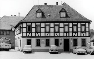 Ehemaliges Gasthaus „Zum Goldenen Kreuz“ (heute Marktplatz 21) mit Reisebus (links), 1950er/60er Jahre; Stadtarchiv Iphofen, Bildersammlung.