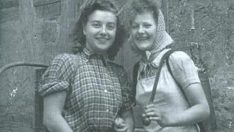 Die Iphöferinnen Frieda Schubert (li) und Lore Welzenbach (re) mit Weinbergsspritzen im Jahr 1945. Die Aufnahme wurde später im Rathaus abgegeben. Sammlung Frieda Schubert (2021); Repro StadtA Ip.