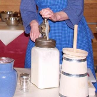 Die Gästeführerin erklärt außerdem die verschiedenen Verfahren zur Butterherstellung, welche Prozesse dabei ablaufen und welchen Stellenwert die Buttervermarktung früher auf dem Dorf hatte, als fetthaltige Nahrungsmittel kostbar und in der Regel Mangelware waren.