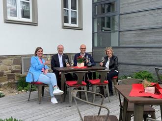 Im Bild zu sehen von rechts nach links: Johanna Meinzinger-Stegmeier, Leiterin der SteigerwaldVinothek Iphofen startet gemeinsam mit dem geschäftsführenden Vorstand der Winzergemeinschaft Franken eG Cornelius Lauter, dem ersten Bürgermeister der Stadt Iphofen Dieter Lenzer sowie der Leiterin der Touristinfo Iphofen Claudia Bellanti, die Terrassensaison bei einem gemeinsamen Glas Sekt.