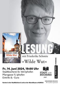 Am Freitag kommt die erfolgreiche Autorin Friederike Schmöe in die Stadtbücherei Iphofen und liest aus ihrem neusten Krimi „Wilde Wut“. Dazu gibt es eine fränkische Brotzeit und leckeren Käseplootz. Alle, die fränkische Krimis und fränkisches Fingerfood lieben, sind herzlich zur Lesung eingeladen. Und wer Bedenken hat das EM Eröffnungsspiel zu verpassen, den können wir beruhigen: zum Anstoß um 21 Uhr sind wir alle wieder daheim!
