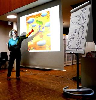 Gekonnt entstanden auf dem Flipchart die Hauptfiguren, ein kleines Krokodil und eine riesige Giraffe, die sich schliesslich ineinander verlieben und zusammen wohnen möchten. Daniela Kulot erzählt zu den farbenfrohen Bildern ihres Buches, die Kinder fiebern mit und bringen Ideen und Lösungsvorschläge ein. Immer wieder bewundern sie die Malkunst der Autorin, wollen wissen, wie man das lernt, wollen auch Malerin oder Autor werden und natürlich möchten sie wissen, wie die Geschichte weitergeht!