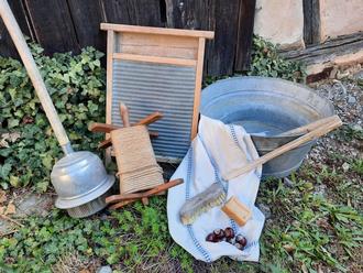 Und genau mit diesen historischen Utensilien geht es ans Werk. Es wird der Heizkessel angeschürt und der Schmutz mit Kernseife, Waschbrett und Bürste bearbeitet. Auf spielerische Art und Weise wird der arbeitsintensive Waschtag zu Uromas Zeiten und das heutzutage einfache „Waschprogramm auf Knopfdruck“ gegenübergestellt.