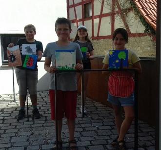 Stolz zeigen die kleinen Künstler ihre Gemälde. Zum Thema Wiese haben die Kinder einen Entwurf erstellt, und diesen dann mit Acrylfarben auf Leinwand übertragen.