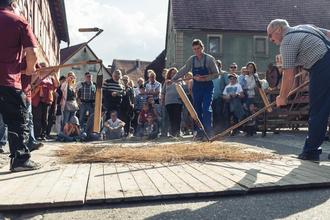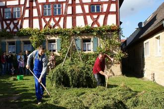 Iphofen-Mönchsondheim. Ein Fest für die ganze Familie ist das „Herbst- und Kelterfest“, zu dem das Freilandmuseum Kirchenburg Mönchsondheim am Sonntag, 2. Oktober 2022 einlädt. Von 11.30 Uhr bis 18 Uhr steht der Herbst als Ernte- und Festzeit auf dem Land im Mittelpunkt. An verschiedenen Plätzen des Freilandmuseums können die Besucher traditionelle Erntearbeiten erleben, zum Beispiel das Dreschen von Getreide oder das Keltern von Äpfeln und Trauben. Besucher dürfen auch selbst mit anpacken, etwa beim Buttern mit dem historischen Butterfass. Mit viel Liebe werden traditionelle, fränkische Leckereien von der Mönchsondheimer Dorfgemeinschaft zubereitet, die heute nicht mehr überall zu finden sind.