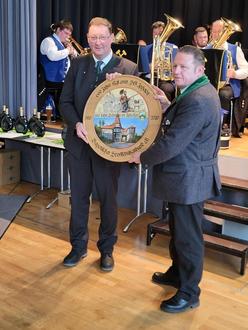 Der 1. Landesschützenmeister Christian Kühn (links) übergibt die Jubiläumsscheibe des BSSB an den 2. Schützenmeister der SG Iphofen Marc-André Behrendt.