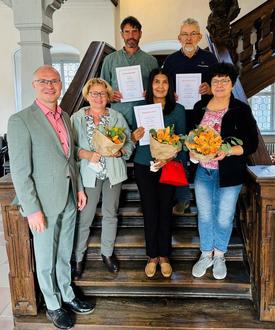von links: 1. Bürgermeister der Stadt Iphofen Herr Dieter Lenzer, Frau Christine Fleischmann-Ryba Verabschiedung in den Ruhestand, Frau Yoo Melber 25-jähriges Dienstjubiläum, Frau Gertraud Kirchner Verabschiedung in den Ruhestand, Herr Christian Kümmel 25-jähriges Dienstjubiläum und Herr Reinhard Wolf 40-jähriges Dienstjubiläum