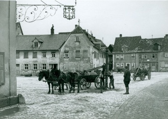Fuhrwerk beim Brunnen am südlichen Marktplatz neben dem Gasthaus „Goldenes Kreuz“ um 1935; Stadtarchiv Iphofen, Bildersammlung