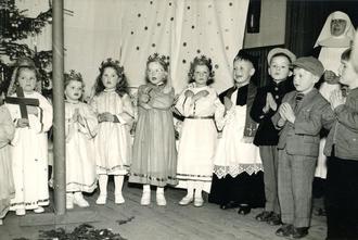 Adventsspiel in der Kleinkinderbewahranstalt Iphofen 1958 (von links die Kinder Margarete, Ulrike, Anni, Gertraud, Monika, Norbert, Klaus, Josef und Werner mit der Mallersdorfer Sr. Stadiola;