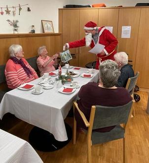 Plötzlich wurde es still. Der Nikolaus betrat den Raum und begann mit dem Gedicht „Drauß vom Wald, da komm ich her …“ und entlockte seinem goldenen Buch die ein oder andere Anekdote. Natürlich ist er nicht mit leeren Händen angereist, so konnte er jedem Bewohner ein Päckchen, das vom Förderverein Iphofen gesponsert wurde überreichen. Mit dem Singen weiterer traditioneller Weihnachtslieder ließen die Bewohner, bestens mit Stollen, Plätzchen und Punsch versorgt, die schöne Feier ausklingen.