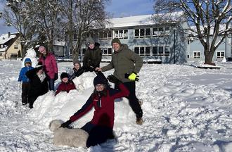 An der Grundschule Hellmitzheimer Bucht brachten Lehrerinnen die Hündin Jana und eigene Kinder mit, um die vier Schülerinnen und Schüler zu beaufsichtigen, mit ihnen zu lernen und die Schneepause zu genießen. Im tiefen Schnee hatten Kinder, Hund und Lehrerinnen viel Spaß bei "Schneeengeln", Iglu und Schneemann bauen oder einfach nur beim Herumtollen. Der Spagat zwischen Organisationsaufgaben, Anbieten und Betreuen von digitalen Lerninhalten und der Notgruppenbetreuung lief reibungslos und machte allen richtig Spaß.