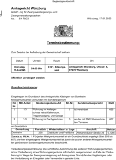 | Dienstag, 15.04.2025 | 09:00 Uhr | B101, Sitzungs- saal | Amtsgericht Würzburg, Ottostr. 5, 97070 Würzburg |