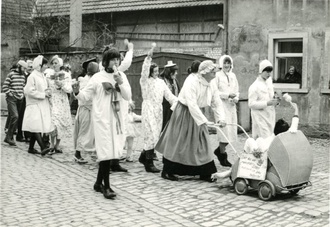 Faschingsumzug in Iphofen um 1967: Schülergruppe mit Lehrer Andreas Brombierstäudl in der Ludwigstraße vor dem Anwesen Popp; Stadtarchiv Iphofen, Bildersammlung (NL Brombierstäudl).
