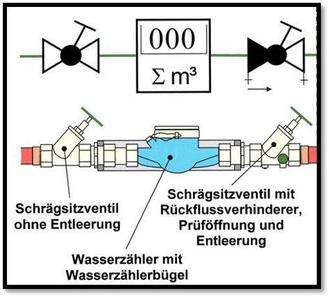 Der Aufbau der Wasserzähleranlagen ist in der DIN 1988 und dem DVGW-Regelwerk (Deutscher Verein des Gas- und Wasserfaches e. V.) W406 festgelegt. Eine korrekt installierte Wasserzähleranlage besteht (in Fließrichtung des Wassers) aus: