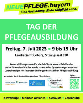 Der Ausbildungsverbund Pflege Region Coburg veranstaltet am Freitag, den 7. Juli 2023 von 9 - 15 Uhr einen „Tag der Pflegeausbildung“ im Landratsamt Coburg. Egal ob noch in der Schule, bereit für eine neue Herausforderung oder auf der Suche nach einer sinnstiftenden Arbeit – alle Interessierten können sich an diesem Tag über die vielen Facetten der generalistischen Pflegeausbildung informieren und bei vielen Mitmach-Aktionen in den Berufsalltag reinschnuppern. Der Austausch mit den Pflegeschulen, lokalen Einrichtungen und Auszubildenden kommt dabei ebenfalls nicht zu kurz.