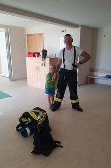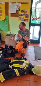 Da viele Kinder in Ernstfall sich vor einen in Feuer auf sie zukommenden Atemschutzgeräteträger verstecken, zeigte ihnen Stefan, wie aus den wohlbekannten Bauhofarbeiter Schritt für Schritt, mit Erklärungen der Atemschutzgeräteträger Stefan wird.