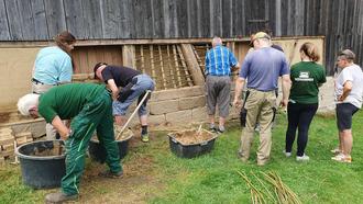 Rainer Scholz vom Arbeitskreis hatte im Vorfeld vor dem Lehmbauseminar am 27. Juli dieses Jahres in der Alten Schäferei in Ahorn eine Menge zu organisieren und trug gemeinsam mit Daniel Fischer vom Schäfereimuseum Material zusammen. Auch der Lehm musste rechtzeitig "angesumpft", also mit Wasser vermischt werden. Wie guter Sauerteig braucht auch ein geschmeidiger Lehm seine Zeit.
