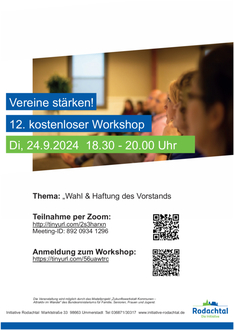 Um die Vereine und damit das bürgerschaftliche Engagement im Rodachtal zu unterstützen, veranstaltet die Initiative Rodachtal seit zwei Jahren eine kostenlose Workshop-Reihe zu relevanten Themen im Vereinsbereich. Am Dienstag, 24. September 2024 findet um 18:30 Uhr der 12. Workshop der Reihe „Vereine stärken“ statt. Das Thema des etwa zweistündigen Online-Seminars lautet dieses Mal: „Wahl und Haftung des Vorstandes – Rechte, Pflichten und Haftungsfragen als Vorstand“.