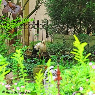 Bei meiner Ankunft stand ein diesjähriger Weißstorch, mit noch teilweise schwarzem Schnabel, in einem Wasserbecken, in einem sehr zugewachsenen, idyllischen Ziergarten in einem Innenhof.