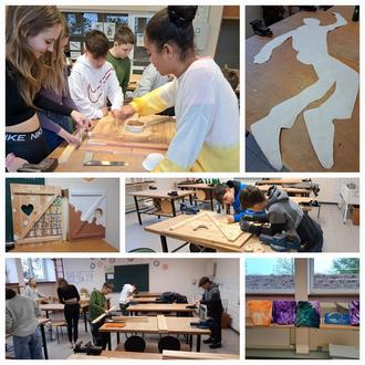 Die Jugendlichen haben im Werkraum der Grundschule zwei Fensterläden gebaut und bemalt, eine Schablone einer Basketballfigur in Echtgröße (einer der Jugendlichen war das Model) vorbereitet und Kissenbezüge gebatikt.