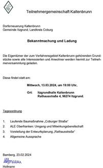 Die Eigentümer der zum Verfahrensgebiet Kaltenbrunn gehörenden Grundstücke sowie alle Interessierten und Anwohner werden hiermit zur Teilnehmerversammlung geladen.