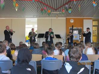 Von der 1. Minute an bezogen die 5 Musiker die Kinder aktiv mit ein. Statt eines reinen Konzerts stand das gemeinsame im Mittelpunkt. Mit bekannten Kinderliedern startete das Quintett ein fröhliches Liederraten. Mit „Pippi Langstrumpf…“ oder „Fluch der Karibik“ uvm. Schon bei den ersten Klassikern schnellten die Hände in die Höhe. Zur Belohnung bekamen 3 Kinder eine CD. Die Kinder erlebten dabei wie unterschiedlich ein Lied klingen kann, wenn es von einer Trompete, Horn, Posaune oder Tuba gespielt wird. Mal hell und strahlend mal weich und rund oder tief und kraftvoll – jedes Instrument erzählte die Melodie auf seine eigene Weise.