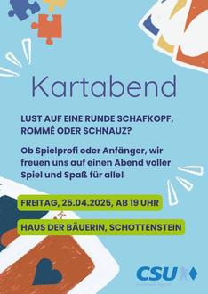 Ihr habt Spaß an einem lustigen Kart- und Spieleabend? Ihr wolltet immer schon mal Schafkopf lernen? Dann seid ihr bei uns genau richtig! Auch für das leibliche Wohl ist bestens gesorgt.