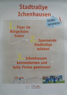 Die Rallye mit den 12 Aufgaben und Fragen ist eine Dauereinrichtung und kann immer wieder durchgeführt werden. Die Flyer liegen im Bürgerbüro im Rathaus aus. Darüber hinaus an mehreren anderen Stellen, beispielsweise im Bayer. Schulmuseum, bei Geldinstituten und in Apotheken in Ichenhausen. Auch auf der Homepage der Stadt Ichenhausen steht der Flyer zum Download bereit. www.ichenhausen.de Um einen der Preise im Wert von 10.- € zu gewinnen, müssen tatsächlich alle Aufgaben richtig gelöst sein. Ein Hinweis an dieser Stelle: bitte bis zum Ende genau lesen! Nicht zuletzt die Aufgabe 12.