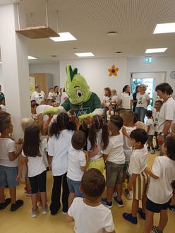 Begleitet durch das Kinderlied "Mitmach-Dschungel-Zeit" begrüßten die Kinder singend das Drachenkind Jolinchen in Lebensgröße. Gemeinsam tanzten sie fröhlich mit ihren selbst gestalteten Jolinchen T-Shirts und dem gesamten Kindergarten-Team.