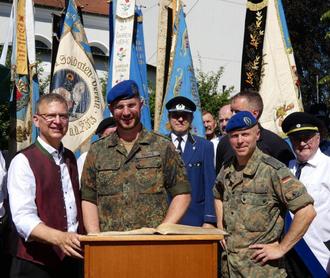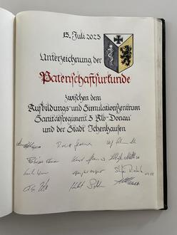 Die Stadt Ichenhausen hat die Patenschaft für das Ausbildungs-simulationszentrum des Sanitätsregiments 3 "Alb-Donau", Dornstadt, übernommen. Im Rahmen des Stadtfestes vor zwei Wochen unterzeichneten Oberfeldarzt Martin Teufel und Ichenhausens 1. Bürgermeister Robert Strobel die Patenschaftsurkunde. Dieser historische Moment wurde auch im Goldenen Buch der Stadt festgehalten, in dem sich auch die Vorsitzenden der sechs Soldatenvereine im Stadtgebiet eintragen durften.