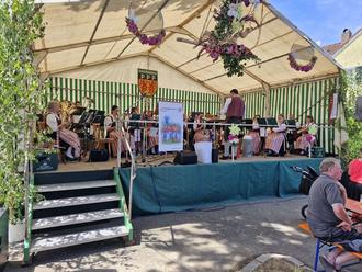 Los gings mit einem kleinen Kirchenzug zum Festplatz unter der Dorflinde. Nach dem Gottesdienst, bei dem wir die traditionelle Schubert-Messe spielten, unterhielten wir das Publikum mit bekannter Blasmusik bei bestem Wetter.