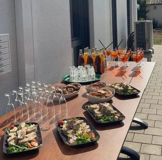 Nach kurzer Zeit des Ruhens ging es gleich weiter ins Musikheim Hochwang, um sich gemeinsam mit Mitgliedern des Partnerschaftsvereins, Vertretern der Wirtschaftsvereinigung und Gästen aus Changé/St. Germain le Fouilloux durch ein von Familie Engel angeführtes Musikverein-Team exzellent zubereitetes, ein für jede Geschmacksrichtung passendes Buffet verwöhnen ließen. Der Wein stammte selbstverständlich von der Ichenhausen freundschaftlich verbundenen Familie Venturelli vom „Corte Fornello“. Bei reichhaltig Speis und Trank mit musikalischer Umrahmung durch die Band „Soundexpress“ vertieften die 92 Gäste aus drei Nationen bei interessanten Gesprächen und Tanz ihre amikablen Beziehungen.