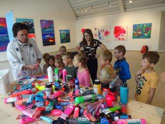 Ganz am Ende des Kindergartenjahres durften die ältesten Kinder die Kunstausstellung von Sigurd Rakel besuchen. Was war das für ein tolles Erlebnis! Zunächst einmal durften wir die vielen bunten Kunstwerke in der Ausstellung anschauen, wobei wir ein Bild unter Anleitung von Johanna Haug ganz genau betrachteten: "Party im Atelier" Vieles konnten die Kinder darauf erkennen, aber besonders interessant war es, den Geschichten des Künstlers dazu zu lauschen. Ganz andächtig waren die Kinder dabei, vor allem, als wir den Arbeitstisch zu Gesicht bekamen!