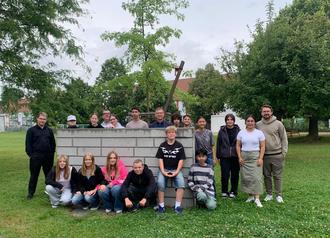 Die Klasse 8bM gemeinsam mit Rektor Markus Donderer, Bürgermeister Robert Strobel, Yonca Necan-Rieck, Initiatorin des Projekts und Klassenlehrerin, sowie Hausmeister Kevin Rieck an der bereits errichteten, jedoch noch ungestalteten Friedensmauer.