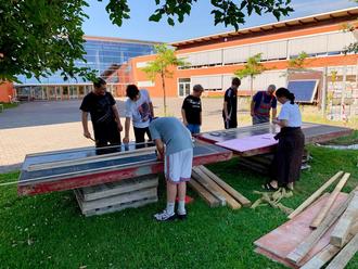 Beim Anbringen der Leisten an die Schalung: Schülerinnen und Schüler der 8bM arbeiten unter Anleitung von Lothar Schwer und Klassenlehrerin Yonca Necan-Rieck an der Struktur für die ziegelähnliche Mauer.