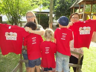 Unser Kindergarten wurde voriges Jahr um eine Gruppe erweitert, deshalb wünschten wir uns neue T-shirts für alle Kindergartenkinder und ihre Erzieherinnen. Dank der Organisation unserer Elternbeirätin Frau Kerstin Konrad und der großzügigen finanziellen Unterstützung durch mehrere Firmen konnten wir diesen Wunsch nun verwirklichen.
