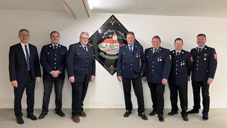 Von links: 1. Bürgermeister Robert Strobel, 1. Kommandant Thomas Stocker, Georg Mussinger, Roland Jantschik, 2. Kommandant und Vorstand Christian Gujber, Kreisbrandmeister Benjamin Pohl, 1. Vorstand Johannes Linder